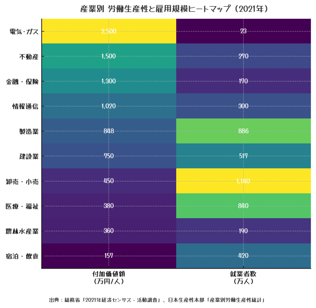 情報通信は生産性がピカイチでも就業者が少なく、卸売・小売は雇用は最大級でも生産性が低い。電力・ガスや不動産は生産性が突出するものの従業員が極端に少なく、地域経済を底上げする力は限定的――という構図がくっきり浮かび上がります。