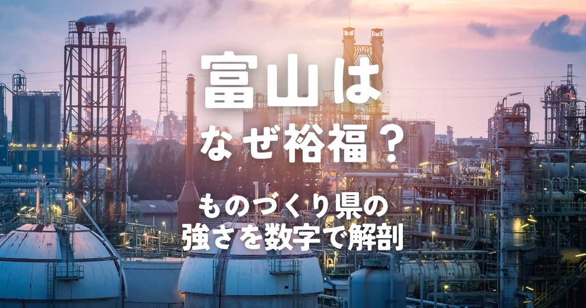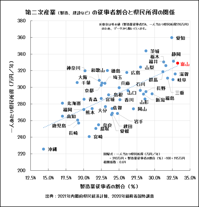 富山県をもう少し深掘りしましょう。製造業従事者割合33.3%(全国1位)、1人当たり県民所得329万円(6位)。