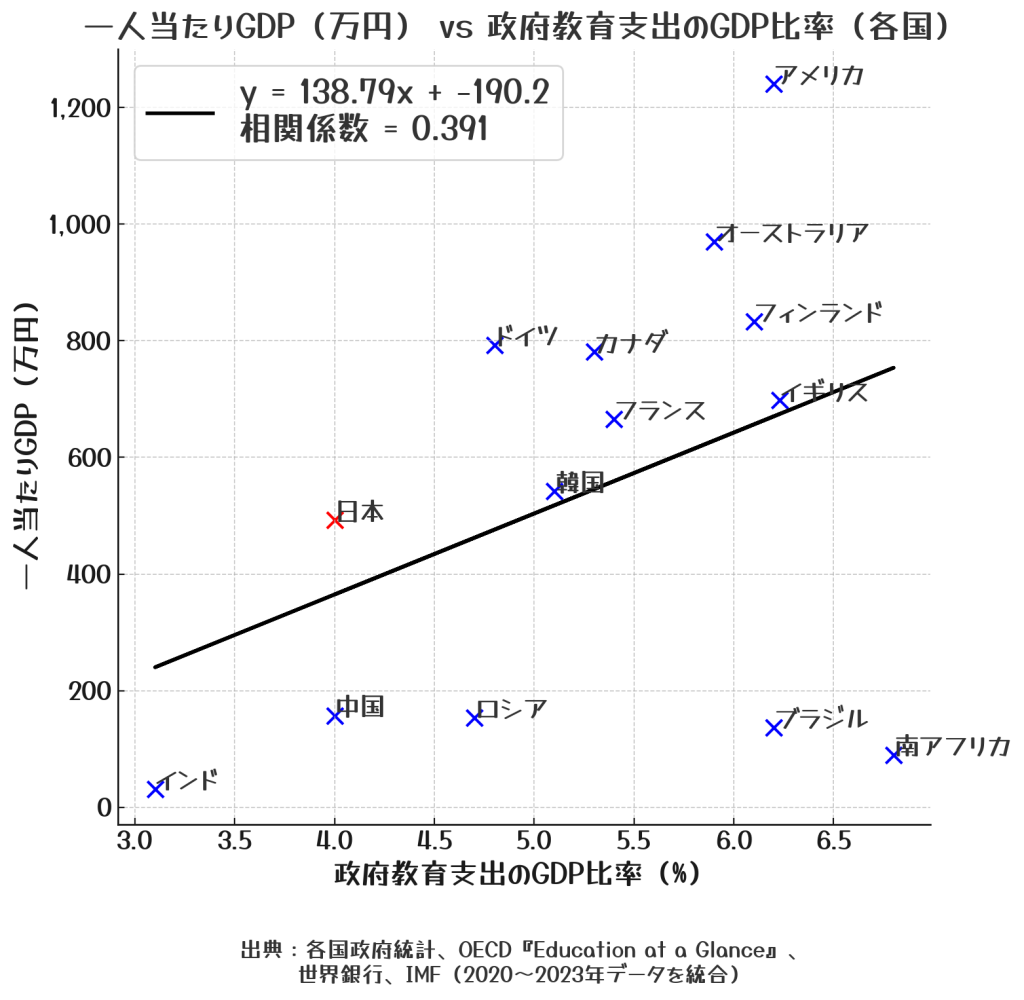 今回のグラフから見えるように、教育への公的支出と経済的豊かさの間には、一定の相関関係があります。
